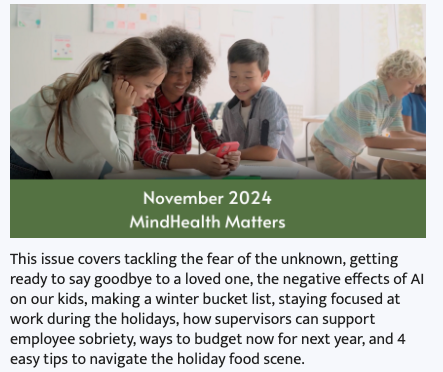 CHeck it OutThis issue covers tackling the fear of the unknown, getting ready to say goodbye to a loved one, the negative effects of AI on our kids, making a winter bucket list, staying focused at work during the holidays, how supervisors can support employee sobriety, ways to budget now for next year, and 4 easy tips to navigate the holiday food scene.